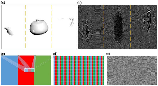 For a more complex 3D scene, multiple layers are produced by slicing the 3D scene with various contents at the same position. Harnessing no overlap between different layers in the hologram, the proposed method eliminates the crosstalk between layers that decreases the reconstruction quality in conventional layer-based methods. However, if the reconstructed image shifts with the location of the sub-hologram rather than being at the center, a broken 3D scene would appear. To correct the position of the reconstruction at the center, a resample method is used as explained in Figure 4. In this demonstration, the original image is a 3D model “teapot”, which is then sliced into three layers according to the depth to form 3 sub-images. The hologram in Figure 4b consists of three sub-holograms generated from sub-images in Figure 4a. As Figure 4c depicts, pixels at the same relative positions in 3 sub-holograms are picked to form a three-pixel unit that is set in a side-by-side way in a new hologram as shown in Figure 4d,e.