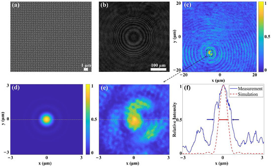 In addition, in order to compare the focusing characteristics between the simulation and the measurement, the simulated electric field intensity distribution of the focal plane for a minimized metalens, which has a relatively small aperture diameter but the same NA of 0.4 as the fabricated metalens, is shown in Figure 5d. In this case, the simulated minimized metalens has an aperture diameter of 60 μm with a focal length of 64 μm, and PML boundary condition is applied at x-direction, y-direction, and z-direction, with the corresponding computation time for such minimized metalens being about 5 h and 18 min. There are two reasons for simulating such a minimized metalens: first, the designed metalens of a 5 mm diameter aperture is composed of over 1.22 × 108 Si3N4 nanofins, demanding excessive computation resources for FDTD simulations in current computing stations; second, when two metalenses of different apertures but the same NA of 0.4 are illuminated under unchanged incident light, their focal spots and the corresponding diffraction limits will theoretically be identical, indicating the same focusing characteristics.