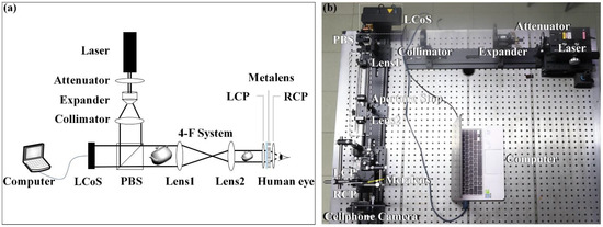 Furthermore, in order to characterize the performance of the proposed metalens in the 3D holographic display, optical imaging experiments were carried out and the experimental setup for the MCGH-NED system is demonstrated in Figure 6. First, a collimated 532 nm laser beam is deflected by a polarization beam splitter (PBS) and hits a phase-only spatial light modulator (SLM), which is a liquid crystal on silicon (LCoS, Holo-eye LETO), as the image engine. This LCoS has a resolution of 1920 × 1080 with the pixel pitch being 6.4 μm. After the hologram-loaded LCoS is illuminated by the laser source the reconstruction is generated and the 3D HRI transmits through an optical 4-F system, composed of two lenses of 200 mm and 100 mm focal lengths with a pinhole between them. The HRI is thus shrunk by a factor of 0.5 in order to fit the maximum display size of the metalens eyepiece, and the measured eye relief is 9 mm, indicating a FOV of 31°.