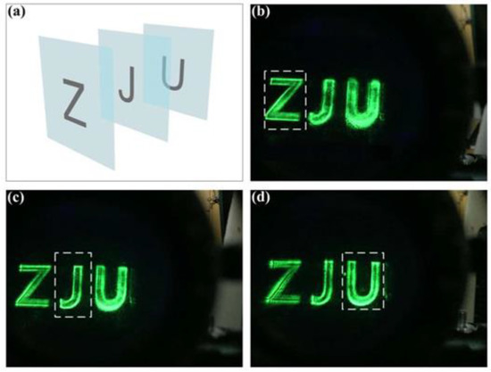 Figure 7 above shows the experimental results of a 3D holographic near-eye display with the designed metalens as an eyepiece. Figure 7a is the original layered model of ZJU. Three sub-holograms are calculated from Z, J, and U, respectively, with different propagation distances, and the propagation distance interval is set at 100 mm. The images are reconstructed at different distances, and as a result, the characters Z, J, and U are separately focused at corresponding positions, as shown in Figure 7b–d. It can be observed that when one of the characters is focused by the metalens eyepiece, the other two characters are blurred.