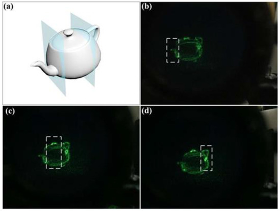 In Figure 8 below, a complex 3D model, “teapot”, is displayed and observed experimentally. As Figure 8a illustrates, the model is sliced into three layers and the spacing between neighboring layers is 100 mm. Then the holograms are produced from these layers according to the resample method mentioned above, and Figure 8b–d are the captured virtual images of the HRI imaged by the metalens eyepiece. It can be seen that the spout of the teapot is focused in Figure 8b, while the lid and the handle are blurred. In contrast, the lid and the handle in Figure 8c,d are focused respectively, while the remaining two parts are blurred when viewing through the metalens eyepiece.