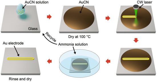 In this study, we introduce an Au electrode fabrication technique that is based on the selective transformation of primitive material at the target spot to drastically reduce the time and cost spent on the synthesis of NPs for the fabrication of electrodes. This facile fabrication method follows the procedures illustrated in Figure 1. We selected AuCN as a target material for the fabrication of Au electrodes through simultaneous refinement and thermocapillary-induced alignment at the target region. AuCN, an inorganic material that contains linear Au–C–N chains [25], is the early product from the extracted ore, and it can be considered as a raw material of refined Au products. AuCN can be decomposed to form metallic gold by various energy sources including heat, electron beams, and ion beams [18,21,22]. Therefore, we can induce the fabrication of Au structures on the target substrates through the minimal coating and selective laser-induced photothermal heating procedures of AuCN.