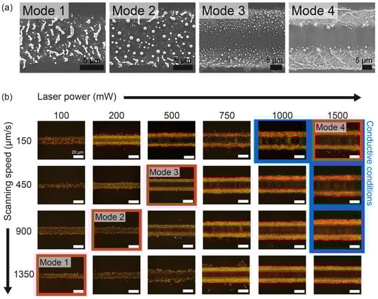 As shown in Figure 3a, the results of the proposed method are largely classified into four modes depending on the laser conditions. The SEM images of each mode describe their characteristics. In the case of mode 1, AuCN is thermally decomposed at its originally coated region by laser irradiation similar to the conventional SLS of Au NPs. However, due to the complexity of the chemical composition of the target material, the resultant Au patterns are disconnected from each other by the vaporization of cyanide that belongs to a large portion of the original material, and the resultant is inappropriate to perform as an electrode. Such occurrence of the voids was even enhanced in mode 2, as the decomposed Au were accumulated on Au islands at the center due to the higher laser intensity than mode 1. As the laser intensity increased further, the thermocapillary force in conjunction with the prolonged melting time started to affect the morphology of the decomposed Au as illustrated in mode 3. The Au particles in the center of the lateral direction were heated more intensively and, at the same time, the thermocapillary force pushed these Au particles to the borders of the laser beam path. However, despite the occurrence of thermocapillary flow, some Au was still widely distributed from the center to the edges in the form of particles, and a significant portion between the Au particles was composed of voids, which is insufficient for Au electrodes overall. Once the thermocapillary force is further escalated, the Au patterns transform into the form of the continuous conductive path as shown in mode 4, although including the empty space in the center of the lateral direction. The sufficient temperature gradient obtained at the adequate laser spot size and laser intensity shapes continuous and conductive double Au electrodes to both sides of the laser scanning path.