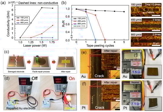 Characterizations of the fabricated Au electrodes by selective laser refining: (a) electrical conductivity of the Au electrodes according to the laser condition; (b) adhesive tape tests of Au electrodes according to the different scanning speeds of 150 μm/s, 450 μm/s, and 900 μm/s at 1.75 W and measurements of relative resistances R0/R (R0: the initial resistance, R: the resistance after tape–peeling cycle) against repeated tape–peeling cycles (inset: optical images of Au electrode after iterative adhesive tape tests), and demonstrations and measurements of the facile repair method to damaged electrodes; (c) Schematic images of facile repair process using selective laser refining; (d) photographs of the circuit using a repaired Au electrode by the proposed method, optical images of both completely disconnected and then repaired (e) Au and (f) Pt electrodes, and the resistance measurements of the repaired electrode, respectively (original resistance of Pt: 7.1 Ω and Au: 1.5 Ω, repaired resistance of Pt: 7.8 Ω and Au: 1.9 Ω).