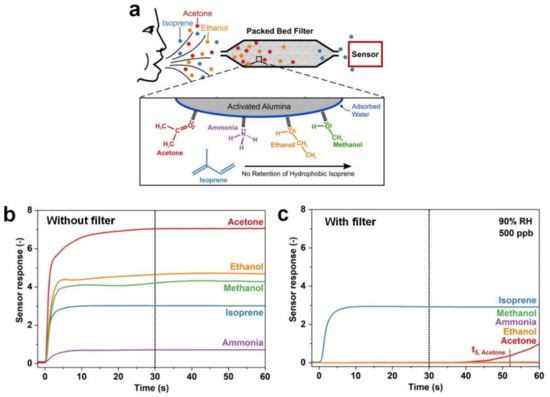 (a) Filter-sensing concept for selective isoprene detection in complex gas mixtures. Responses of a Pt-doped SnO2 sensor at 90% RH to 500 ppb of isoprene and other gases (b) without and (c) with activated alumina filter. Using the activated alumina filter, hydrophilic analytes are held back until their characteristic breakthrough time t5, while the response of isoprene is unchanged. Reproduced with permission from [76] American Chemical Society, 2018.