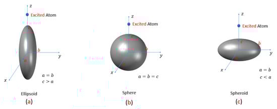 Then, the analysis procedure is to solve the integration of for both ellipsoid and spheroid shapes then apply it in Equation (14), to obtain the normalized radiative decay rate for the structures of ellipsoid, sphere, and spheroid. More details about the mathematical solution of this integral is presented in Section S1 (Supplementary Materials). The coupled excited atom is considered to be located at different distances away from the surface of each geometry shape. In the case of the ellipsoid, where is approached to be a cylinder and the excited atom is located along its major axis. On the other hand, is approached to be a disc in the case of spheroid and the exited atom is located along its minor axis, as shown in Figure 2. To calculate the normalized decay rate for the ellipsoid and the spheroid, we substitute with for the ellipsoid to determine the value of the integration as shown in Equation (15); then, similarly by substitution when for the spheroid. For both ellipsoid and spheroid geometrical cases, the integral is expressed as concluded in both Equations (17) and (18), respectively.