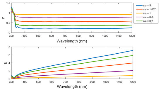 Figure 3 shows both refractive index and extinction coefficient for ellipsoid, sphere, and spheroid at different aspect ratios. The saturation spectrum of the RI curves start at the wavelength of approximately 350 nm at all selected aspect ratios. The saturation level contrasts for the ellipsoid, sphere, and spheroid according to different aspect ratios with the reduced value of saturation levels for the ellipsoid at higher aspect ratios. Then, the RI value increases to the maximum at the case of sphere, and then decreases again according to the smaller aspect ratio of the spheroid. On the other hand, there is an incremental slope of the extinction coefficient spectral curves at aspect ratios far from the sphere case of c/a = 1. In general, the slopes are higher in the case of ellipsoid than the slopes of the spheroid. As a result, the absorption and damping oscillation in case of ellipsoid is expected to be slightly larger than the spheroid.