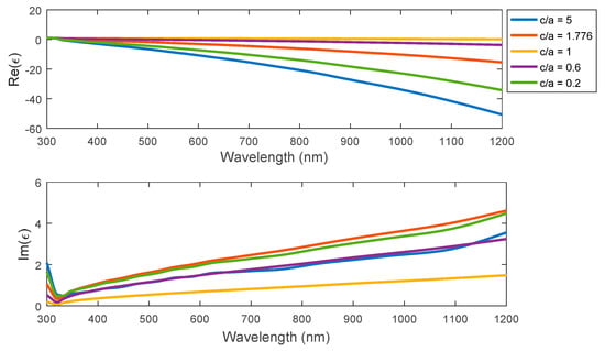 Based on Equation (6), both the real and imaginary parts of the permittivity analysis have been presented as shown in Figure 4, with a similar behavior to the previously mentioned n and k spectral characteristics. In more detail, the spectral change of the real permittivity is larger with an increasing aspect ratio for the ellipsoid or a decreasing aspect ratio for the spheroid, with nearly constant permittivity for the case of sphere. For the imaginary part, the magnitude starts to be reduced at relatively shorter wavelengths in the near-UV region. However, for both visible and IR regions of the spectrum, the value of the imaginary part of permittivity has an increment behavior that is opposite to the real part performance.