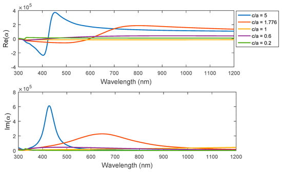 The real and imaginary parts of polarizability with different aspect ratios (c/a) for the studied elliptical geometries.