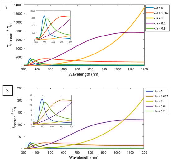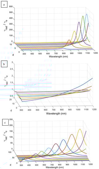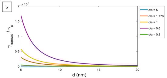 In this section, the non-radiative decay rates for the ellipsoid, sphere, and spheroid are discussed. The variation of non-radiative decay rate depends on the dimension ratio c/a. Both spheroid and ellipsoid with aspect ratios, such as 0.2 and 2.5, respectively, have maximum peaks at near UV regions, as shown in Figure 9. Unlike radiative decay rate analysis, the separation distance does not affect the spectral behavior of non-radiative decay rate. Figure 9a,b shows that the spectral performance of non-radiative decay rates for different aspect ratios of elliptical nanostructures are similar at different distances to excited atoms, but with smaller values of the decay rates according to higher distance. This leads to reduce the losses effect or non-radiative coupling as long as the excited atom located away from the plasmonic elliptical nanoparticle.