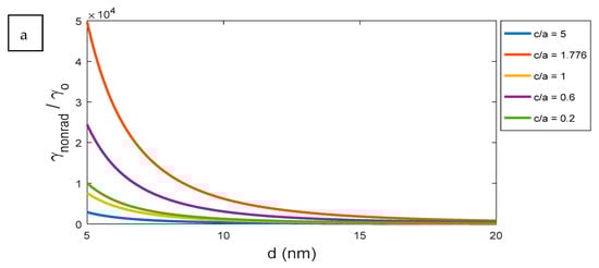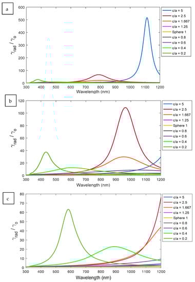 At certain wavelengths, the optimum design of the nanoparticle in different aspect ratios for visible and infrared wavelength can be determined, as shown in Figure 8. In the visible range closed to green emission at 550 nm, as an example, the spheroid of c/a = 0.2 becomes an optimum choice for the best radiative decay rate at a distance around 10 nm, as presented in Figure 8a. Within the IR region, such as 880 nm for example, both the ellipsoid and the spheroid offer optimum decay rates but at different designed distances. In more detail, the spheroid of aspect ratio 0.2 allows for a larger distance with the coupled excited atom up to 18 nm, as shown in Figure 8b. On the contrary, the ellipsoid offers a relatively large peak value of radiative decay rate, but at much smaller distances of less than 5 nm. Here, the flexibility in the selected distances and aspect ratios of the designed elliptical nanostructures give wide variety of applications such as energy harvesting and sensing within different spectral regions.