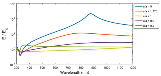 The spectral curves of enhancement factor for ellipsoid, spheroid, and sphere are presented in Figure 11. The ellipsoid with c/a = 5 has the greatest peak value at wavelength 880 nm, then the peaks are decreased gradually with blue-shifted peaks toward the lowest wavelength whenever the aspect ratio decreases. The enhancement factor for both cases of sphere and spheroid are generally lower in intensity compared to the ellipsoid structure. Whereas, the enhancement factor of the sphere does not have a peak over the studied spectrum, but increases slightly with a longer wavelength. The enhancement of local electric field is increasing where the resonance occurs in prolate particles or near the spikes. That is clear in the cases of higher aspect ratios of the ellipsoid or smaller (c/a) for the spheroid.