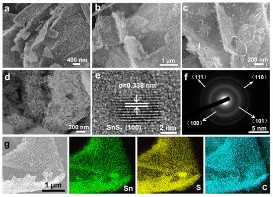 (a) FESEM image of Sn/RGO-based precursor. (b,c) FESEM images of SnS2/RGO at different magnifications. (d) TEM image of SnS2/RGO. (e) HRTEM image of SnS2/RGO. (f) Corresponding SAED pattern. (g) A typical FESEM image of SnS2/RGO and the corresponding elemental mappings of Sn, S and C elements (as labeled).