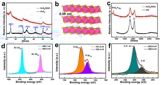 The composition of two samples is investigated by X-ray diffraction (XRD). It can be seen that SnS2/RGO and SnS2 show similar diffraction peaks (Figure 3a) and the diffraction peaks can be attributed to hexagonal SnS2 with P-3m 1 (164) space group (JCPDS no. 23-0677), corresponding to the above mentioned HRTEM and SAED results. There are no obvious diffraction peaks for the carbon phase due to its poor crystallinity. Figure 3b shows a typical 2D layered crystal structure of SnS2, with an interlayer spacing of 0.59 nm. The Raman spectra of SnS2/RGO and GO are shown in Figure 3c. It can be seen that SnS2/RGO and GO have distinct characteristic peaks at ~1344 and 1602 cm−1, which can be attributed to the D (disordered carbon) and G (graphitic carbon) bands of graphite. Moreover, the intensity ratio of D-band to G-band (ID/IG) is 1.06, 1.37 for GO, and SnS2/RGO, respectively, indicating more defects in SnS2/RGO [21,22]. In addition, SnS2/RGO exhibits a peak located at 313 cm−1, which corresponds to the A1g vibration of SnS2 [23,24]. Figure S3 presents the N2 adsorption-desorption isotherm profiling of SnS2/RGO. The relatively large surface area (33.885 m2 g−1) and abundant pores (0.159 cm3 g−1) of SnS2/RGO can provide adequate active sites and promotes the rapid transport of electron and ions. X-ray photoelectron spectroscopy (XPS) was further carried out to investigate the surface electronic states and the chemical compositions of SnS2/RGO. The characteristic peaks of Sn 3d, S 2p, C 1s, and O 1s are observed in the wide survey spectrum (Figure S4). Figure 3d shows the Sn 3d spectrum, in which two strong peaks at 486.1 and 494.5 eV correspond to Sn 3d5/2 and Sn 3d3/2 of Sn4+ in SnS2/RGO [25,26]. The high-resolution S spectrum can be convoluted into two peaks at 162.4 eV and 161.3 eV, corresponding to S 2p3/2 and S 2p1/2 of S2− (Figure 3e), which further confirms the formation of SnS2 [27,28]. As presented in Figure 3f, the C 1s spectrum can be divided into two peaks and assigned to the C-C (284.8 eV) and C-O (286.5 eV) bonds, respectively [29,30].