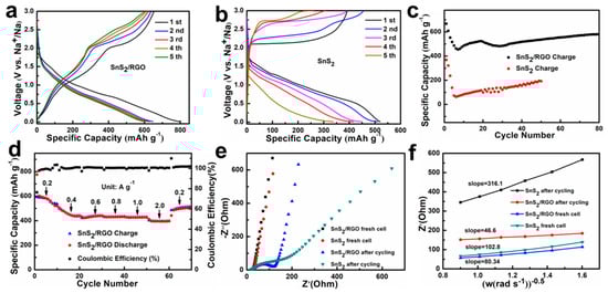(a,b) Discharge/charge curves of SnS2/RGO and SnS2 at 0.1 A g−1. (c) The cycling performance of SnS2/RGO and SnS2 at 0.5 A g−1. (d) Rate capability at different current densities (0.2–2 A g−1). (e) The electrochemical impedance spectra of the SnS2/RGO and SnS2 were obtained before and after 10 cycles at 0.2 A g−1. (f) The relationship between the Zre and ω−1/2 in the low frequency of SnS2/RGO and SnS2.