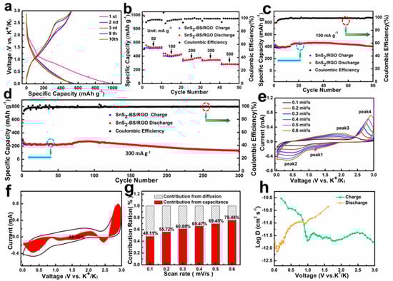 (a) Discharge/charge profiles of SnS2/RGO at 50 mA g−1 in the potential range of 0.01–3.0 V vs. K/K+. (b) Rate capability of SnS2/RGO. (c,d) Cycling performance of SnS2/RGO at 100 mA g−1 and 300 mA g−1, respectively. (e–g) The kinetics and quantitative analysis of the K+ storage behavior for SnS2/RGO anodes. (h) Calculated diffusion coefficients during charging and discharging from SnS2/RGO.