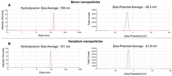 Hydrodynamic size assessed by dynamic light scattering and zeta potential evaluated by electrophoretic light scattering of boron nanoparticles (A) and vanadium nanoparticles (B) dispersions (at 0.02%, diluted in ultrapure water).