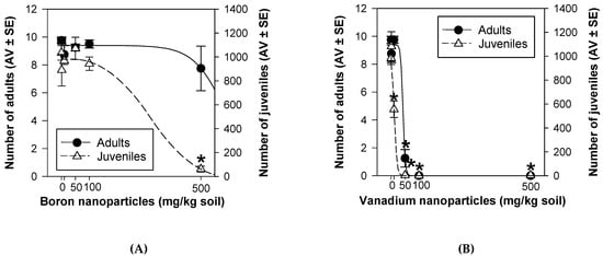 Effects of boron nanoparticles (A) and vanadium nanoparticles (B) spiked LUFA 2.2 soil on survival (number of adults) and reproduction (number of juveniles) of Enchytraeus crypticus after 28 days. Results are expressed as average value (AV) ± standard error (SE) (n = 4). Lines represent the models fit to data. * Significant differences to control (p < 0.05).