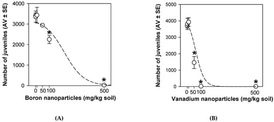 Effects of boron nanoparticles (A) and vanadium nanoparticles (B) spiked LUFA 2.2 soil on reproduction (number of juveniles) of Enchytraeus crypticus after 56 days. Results are expressed as average value (AV) ± standard error (SE) (n = 4). Lines represent the models fit to the data. * Significant differences to control (p < 0.05).