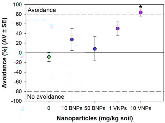 Considering the tested conditions, there was a tendency of the organisms to avoid the VNPs-contaminated soils, with this response being significantly different from the control at 10 mg/kg (83.6% of avoidance—Figure 6). BNPs did not significantly induce avoidance responses of the organisms compared with control group (p > 0.05; Figure 6).