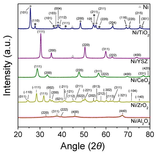- Richardson, J.T.; Scates, R.; Twigg, M.V. X-ray diffraction study of nickel oxide reduction by hydrogen. Appl. Catal. A Gen. 2003, 246, 137–150. [Google Scholar] [CrossRef]