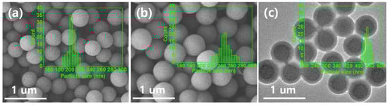 Figure 1 illustrates that the prepared PSMA and core–shell nanoparticles are spherical, uniform, and well dispersed. Furthermore, the SEM images show that the PSMA particle size tends to increase slightly as the MA ratio increases (Figure 1a,b). When the MA ratio was increased from 5 to 30 wt%, the average particle size distribution increased to approximately 45 nm. This was due to the surfactant effect of MA in the soap-free emulsion system. When PEI is added to the PSMA nanoparticles, the particle size increases from 220 nm to 522 nm up to a PEI:MA ratio of 0.08 (Figure 1c).