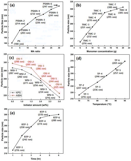 Particle size of PSMA plotted against the (a) monomer (MA) ratio, (b) monomer concentration, (c) initiator amount, (d) reaction temperature, and (e) reaction time.