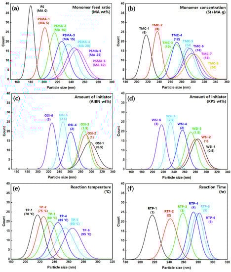 Particle size distribution of PSMA with respect to the (a) monomer (MA) ratio, (b) monomer concentration, (c) effect of oil-soluble initiator (AIBN), (d) effect of water-soluble initiator (KPS), (e) reaction temperature, and (f) reaction time.