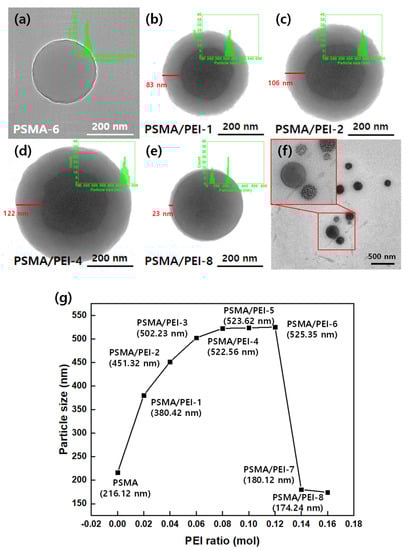 In Figure 4g, the variation in particle size between the PSMA core without PEI addition and the PSMA/PEI-1 core–shell following the addition of PEI can be seen. In addition, the particle size increased for PSMA/PEI-1–PSMA/PEI-4, those of PSMA/PEI-5 and PSMA/PEI-6 exhibited resemblance, and those of PSMA/PEI-7 and PSMA/PEI-8 (174 nm) were found to have decreased.