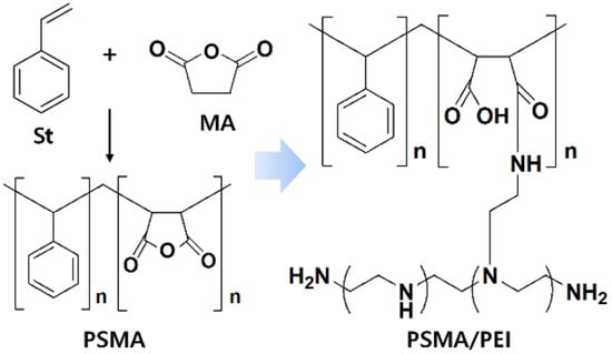 All chemical reagents used here were general-purpose reagents, and deionized (DI) water was used to prepare all the solutions. Styrene (99% purity) and the inhibitor removal column were purchased from Sigma-Aldrich, Inc. (St. Louis, MO, USA). Prior to polymerization, St was eliminated from the inhibitor (4-tert-butylcatechol) using an ammonium oxide column. Maleic anhydride (MA) and PEI (branched, average Mw = 25,000) were also purchased from the same company, and the initiators were from Daejung Chemicals and Metals Co. Ltd. (Siheung, Korea). Potassium persulfate (KPS) and 2, 2-Azobisisobutyronitrile (AIBN) were recrystallized in DI water and methanol, respectively.