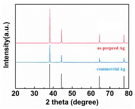 XRD patterns of the as-prepared and commercial Ag powders.