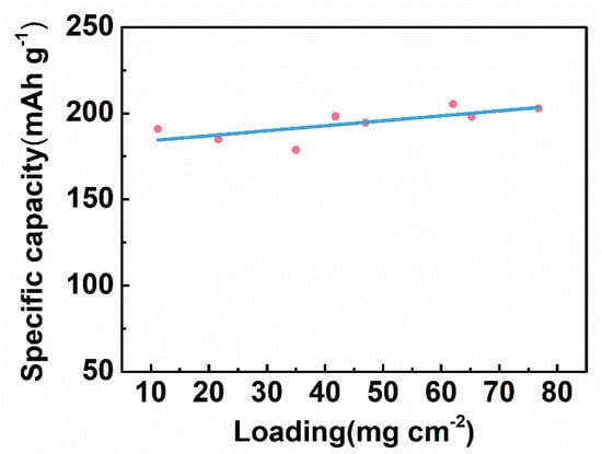 In general, the increase in the active substance loading (the active substance mass per unit area) leads to the decrease in the specific capacity. As the active substance loading increases, the electrode becomes thicker, which hinders the electrolyte penetration and ion migration, resulting in the decrease in the electrode capacity. For electrical stimulation, a higher total capacity of the tDCS electrode ensures a longer service life at the constant current mode. When increasing the active substance loading, the specific capacity can remain unchanged, and thus the effective stimulation time can be prolonged. Therefore, it is well worth optimizing the active substance loading. As plotted in Figure 8, the specific capacity of the CNT/Ag/AgCl-721 electrode is almost unchanged with the active substance loading ranging from 10 to 80 mg cm−2. Therefore, the service life of the CNT/Ag/AgCl-721 electrode can be extended by increasing the active substance loading in this range.
