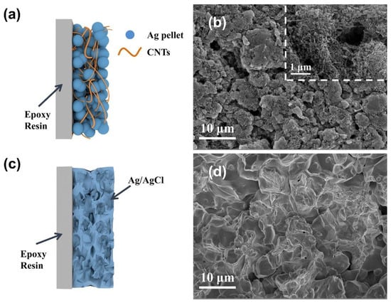Illustrative diagram of the (a) CNT/Ag/AgCl-721 and (b) sintered Ag/AgCl electrodes; SEM images of the (c) CNT/Ag/AgCl-721 and (d) sintered Ag/AgCl electrodes.