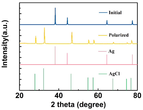 During constant current anodal polarization, the chemical composition of the CNT/Ag/AgCl electrode was studied by X-ray diffraction (XRD). The XRD patterns of the initial and polarized CNT/Ag/AgCl-721 electrodes are shown in Figure 11. The characteristic diffraction peaks of the initial CNT/Ag/AgCl electrode are highly consistent with the standard powder diffraction card of JCPDS silver file (JCPDS No. 87-0597). After anodal polarization, all the characteristic diffraction peaks are consistent with the standard diffraction peaks of AgCl (JCPDS No. 31-1238), indicating the Ag was converted to AgCl.