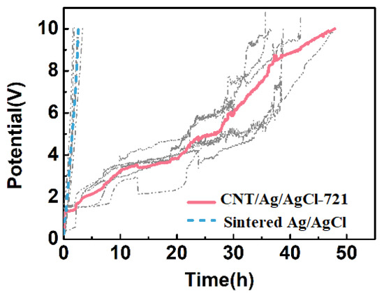 During the first cycle of charging, the electrode potential variation of the CNT/Ag/AgCl and the sintered Ag/AgCl electrodes with time.