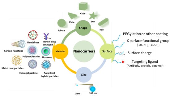 Nanotechnology has great promise for the prevention, diagnosis, and treatment of disease []. Drug delivery using nanocarriers has received particularly extensive attention (Figure 1) []. Nanocarriers can help to minimize the side effects of drugs, and enhance the therapeutic efficacy and targeting precision [,,]. Liposomes [], nanoemulsions [,], Pickering emulsions [], micelles [,], dendrimers [], and polymeric nanoparticles have all been widely explored as carriers for drug delivery systems [], but despite the significant body of work carried out there remain many challenges to overcome, particularly in terms of solubility and the accuracy of targeting [,].