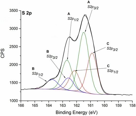 S 2p region (Figure 3) can be fitted into three components [31]. The intermediate doublet, denoted as “A” (S 2p3/2 at 161.5 eV), could be ascribed to sulfur S2− ions in WS2. Species at higher and at lower binding energy (S 2p3/2 at 162.6 eV and 160.9 eV, denoted as “B” and “C”) could be instead ascribed to two kinds of sulfur ions, S22− and S2−, respectively, related to the formation of WOxSy in a mixed oxygen-sulfur environment, likely associated with WOx species identified in W 4f signal. It can be observed that the ratio between the doublet peaks of S 2p species at higher binding energy “B” is higher than the theoretical one (0.5). This could be due to the minor contribution of other sulfur species at higher oxidation states. The atomic ratio between S 2p and W 4f (considering the components related to 1T’ and 2H phases) is equal to 2.2, in good agreement with the theoretical one based on the stoichiometric ratio.