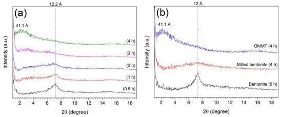 X-ray diffraction patterns of (a) the bentonite/gum rosin powder mixture at various milling times and (b) the OMMT compared to the pristine and milled bentonite.