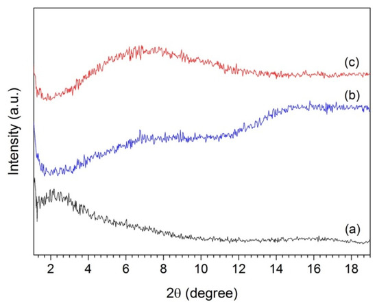 It is obvious that the spectrum associated with the organo-modified MMT (Figure 2c) is a combination of all assignments of pristine bentonite mineral and gum rosin. The small changes in frequency shifts and the decreased intensity of some peaks reveal the formation of some new interactions within the bentonite mineral and gum rosin. For instance, the slight upward peak shift of the CH2 bonds to 2934 and 2872 cm−1 in the FTIR spectrum of OMMT points to the gauche conformation of organic molecules within the MMT galleries [52].