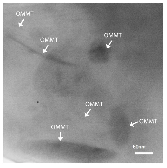 A typical TEM image of the OMMT-modified rubber is shown in Figure 6. Since the OMMT is the only particle-shaped ingredient in the polymeric phase, the darker regions reveal the presence of few-layer OMMT platelets. The existence of exfoliated or single-layer OMMTs can hardly be distinguished from the rubber matrix by the means of TEM measurements due to the limited resolution/contrast, but the presence of exfoliated platelets can be recognized through the AFM analyses of the OMMT powder (Figure 3e,f) and the XRD results of OMMT-modified rubber (Figure 5c). Furthermore, based on Figure 6, the OMMT layers show different sizes and random orientations, as also demonstrated by others [64].