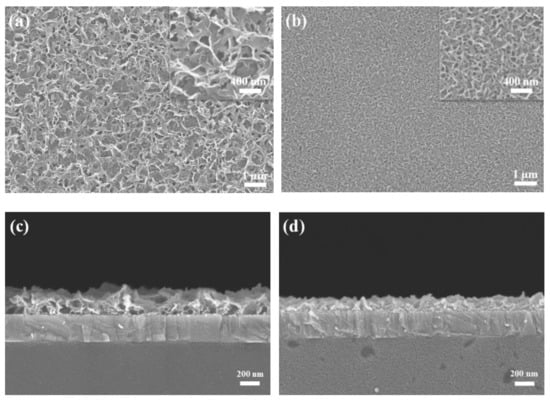 ZnO NWLs are reported to have intertwined honeycomb or sponge-like nanostructures [5,30]. There are two ways to grow NWLs on the substrate via the hydrothermal method as per the previous reports [28,29]. The first way contains three steps, including the deposition of ZnO seed layer, growth of ZnO nanorods, and etching of nanorods with an aqueous KOH solution to form NWLs. The formation of NWLs is ascribed to defect-selective dissolution in (001) planes and etching along the c-axis by OH− in chemical bath. Shin et al. firstly prepared ZnO NWLs by etching in KOH solution [31]. A ZnO sidewall of approximately 30 nm was formed by the partial dissolution of the (001) surface of the ZnO thin film after etching for 15 min. The formed ZnO NWLs were utilized as the electron transport layer (ETL) for fabricating inverted polymer solar cells, revealing a power conversion efficiency (PCE) value of 1.8%. Liang et al. also prepared ZnO NWLs using the similar etching technique to form much denser structures [28]. The inverted polymer solar cells based on dense ZnO NWLs reached a PCE value of 2.14%. The second way also involves three steps, including the deposition of ZnO compact layer, thermal evaporation of an aluminum (Al) thin layer, and growth of ZnO NWLs in chemical bath. The formation mechanism of NWLs is attributed to prohibition of ZnO growth along the [001] direction while allowing the occurrence of lateral growth, as proposed by Chu and coworkers [27]. The ZnO NWLs were grown on silicon wafer using an aluminum mask in conjunction with a hydrothermal method, which produce two cathodoluminescence peaks at 378 and 560 nm. They also found that ZnO nanoflowers would form on NWLs by controlling the concentration of hexamethylenetetramine (HMT) and reaction time. Tang et al. also used the same method to grow ZnO NWLs with a large number of sponge-like pores [5]. The thickness of the film and sidewalls was measured to be 320 and 30–80 nm, respectively. The formed ZnO NWLs were utilized as the ETL for the fabrication of perovskite solar cells with the configuration of indium tin oxide (ITO)/ZnO NWLs/perovskite/Spiro-OMeTAD/Ag. The optimized device achieved a moderate PCE value of 13.6%. Feng et al. changed the molar ratio of the two starting materials zinc nitrate hexahydrate and HMT to prepare ZnO NWLs [10]. When the molar ratio of zinc nitrate hexahydrate and HMT was controlled to 1:1 or 2:1, similar NWL structures were formed. As the concentration of HMT was increased (molar ratio = 1:2), flower-like ZnO nanoparticles on top of NWLs were observed. It is seen that HMT is a popular chemical compound used in the literature to control or modify the structure of ZnO nanomaterials [20]. To date, changing the concentration of HMT has led to complex ZnO nanostructures. The preparation of ZnO NWLs with uniform thickness and controllable pore size is still undergoing.