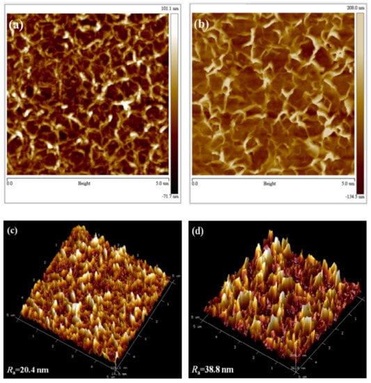To study the effects of the HMT concentration on the morphology of ZnO NWLs, the HMT molar concentration was varied from 1 to 5 mM, while the concentration of zinc nitrate hexahydrate was fixed at 25 mM. The top-view SEM images of the Ni-doped ZnO NWLs with 1, 3, and 5 mM HMT are depicted in Figure 2b and Figure 4a,b, respectively. All of these samples showed sponge-like nanostructures. It can be seen that the pores of ZnO NWLs significantly become larger as the HMT concentration increases. The cross-sectional SEM images of the Ni-doped ZnO NWLs with different HMT concentrations are displayed in Figure 2d and Figure 4c,d, respectively. As shown in Figure 4d, the ZnO NWLs with 5 mM HMT have the largest and intact nanosheets among three samples; smaller and denser nanosheets were formed when using 1 or 3 mM HMT. Based on these cross-sectional SEM images, the thickness of the Ni-doped ZnO NWLs with 1, 3 and 5 mM HMT is estimated to be 150, 175, and 250 nm, respectively. It was observed that ZnO nanosheets grew larger and intact as the HMT concentration increased. The reason to this phenomenon can be explained as follows. The hydrolysis of HMT in water produces OH− hydroxyl ions which react with Zn2+ ions to form zinc hydroxide ions Zn(OH)42− [27]. Higher HMT concentration leads to more Zn(OH)42− ions in the solution to develop fast nucleation of ZnO crystallites. As the HMT concentration was increased to 7 mM, some flower-like aggregates formed (see Figure S1 in the supplementary information). Mirabella and coworkers proposed the growth kinetics and photocatalytic activity of ZnO NWLs [30], stating that a more interlaced structure and a higher density of NWLs were produced when incorporating extra ammonium hydroxide. Our study provides a different way to modify the morphology of ZnO NWLs by adjusting the HMT concentration. To the best of our knowledge, this is the first report that discusses relationship between the morphology of ZnO NWLs and HMT concentration. The AFM topographic and 3D images of the Ni-doped ZnO NWLs with HMT concentrations of 1, 3, and 5 mM are shown in Figure 3b,d and Figure 5a–d), respectively. It was found that AFM images of those ZnO NWLs are basically consistent with SEM observations. The Ra values of the Ni-doped ZnO NWLs with HMT concentrations of 1, 3, and 5 mM were 12.2, 20.4, and 38.8 nm, respectively. The surface roughness of ZnO NWLs was enlarged with increasing the HMT concentration, since the increased HMT concentration promoted fast nucleation of ZnO crystallites for the growth of NWLs. The EDS analysis confirms the existence of Zn, O, and Ni elements of the prepared Ni-doped ZnO NWLs using 1 mM HMT (see Figure S2 in the Supplementary Information), in addition to In and Sn from the ITO substrate and the Al deposited layer by thermal evaporation. The actual Ni doping content was 2.5 wt% in ZnO NWLs. The observation of Al signal in ZnO NWLs was also reported by Chu’s group when adopting the three-step deposition method [27].