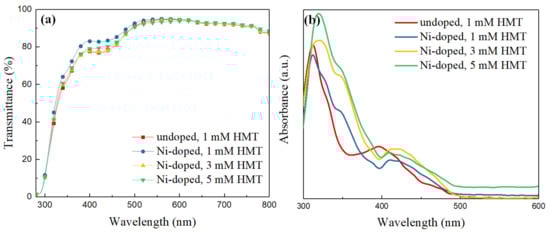 The transmission and absorption spectra of the undoped and Ni-doped ZnO NWLs from 300 to 800 nm are shown in Figure 6a,b, respectively. The transmittance of ZnO NWLs reaches 80% at 400 nm and nearly 90% in the range of 500–800 nm. The high transmittance of ZnO is beneficial for efficient photon input and/or output with reduced energy loss for different optoelectronic applications. The UV–Vis absorption spectra of different ZnO samples are depicted in Figure 6b. The absorption maximum of ZnO is located at 320 nm, while a shoulder at around 360 nm for those Ni-doped ZnO NWLs is observed, which is in agreement with the previous literature [12]. Furthermore, the absorbance of ZnO becomes stronger with increasing the HMT concentration because of more ZnO nanosheets formed in the hydrothermal bath [27].