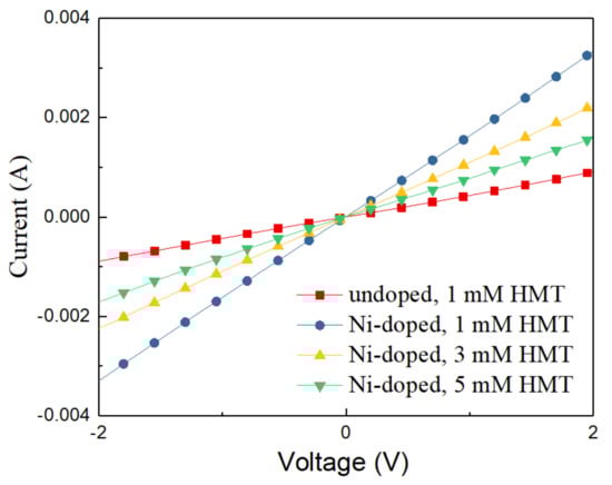 To investigate the effect of Ni-doping and HMT concentration on the electrical conductivity of ZnO NWLs, electron-only devices with the structure of ITO/undoped or Ni-doped ZnO NWLs/Au were fabricated, and the corresponding I–V characteristics are shown in Figure 7. It is clearly seen that the devices based on the Ni-doped ZnO NWLs possess greater slope and higher electrical conductivity than that of the undoped one, indicative of enhanced electron transport ability for the Ni-doped ZnO NWLs. Moreover, the electrical conductivity of the Ni-doped ZnO NWLs with the HMT concentration of 1 mM was higher than with 3 or 5 mM HMT. This is because higher HMT concentration facilitates faster nucleation of ZnO that leads to an increment in the total thickness. With regard to the future application of the synthesized ZnO nanomaterials, both the amounts of Ni dopant and HMT should be carefully controlled to achieve high device performance.