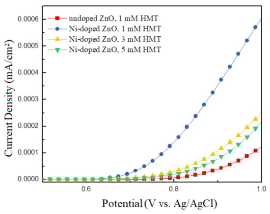 To evaluate the electrochemical activity of the undoped and Ni-doped ZnO NWLs, I–V characteristics of the four samples in a three-electrode cell were measured. In this part, we adopted LSV experiments to evaluate the activity of the catalyst for hydrogen and/or oxygen evolution reactions. Some bubbles were produced near the working electrode of the prepared ZnO NWLs when the bias voltage was applied. The LSV was measured to investigate the correlation between current densities and bias voltage, as shown in Figure 8. It can be seen that the undoped ZnO NWLs exhibited lower current density than the other three Ni-doped ZnO NWLs. The prepared Ni-doped ZnO NWLs exhibited better electrochemical activity, which could be attributed to Ni doping to enhance electron transport ability of ZnO. Particularly, the Ni-doped ZnO NWLs with the HMT concentration of 1 mM revealed 6-fold higher current density at 1 V bias compared with the undoped ZnO NWLs, which demonstrates the best electrochemical performance due to the largest surface area and enhanced electron transport ability. It is reported that nanostructured catalyst has more active sites per geometric area to facilitate diffusions of ions, electrolytes, and generated gas [34]. Apart from our ZnO NWLs, graphdiyne NWLs have also been utilized as the catalyst for water splitting [35]. The structure-controlled graphdiyne NWLs showed effective application in water oxidation, revealing a current density of 0.25 mA/cm2 at a bias of 1 V and realizing significantly improved electrochemical activity and stability. Liu et al. utilized ZnO nanorods array as the catalyst for LSV measurement, receving a current density of 0.2 mA/cm2 by applying a bias of 1 V [36]. Compared with those reports, the prepared Ni-doped ZnO NWs in this study possessed a much lower current response that should be further optimized. It is concluded that the design and synthesis of porous nanomaterials is a key issue to achieve efficient electrochemical performance with enlarged surface area and electrical conductivity.