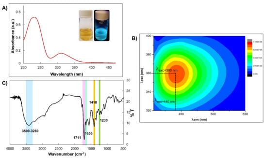 (A) Absorption spectra of CDs (inset: CDs under white (left) and UV light (right)), (B) 2D-contour diagram of excitation/emission spectra of CDs, and (C) FT−IR spectrum of CDs.