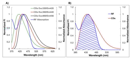 The selection of the excitation wavelength of the donor (CDs) was made according to the overlap of its emission spectrum with the absorption spectrum of the acceptor (RF). A solution of CDs (4 × 10−2 mg/mL) and a solution of RF (10 µM) were prepared in phosphate buffer at pH 7.4 (3 mM). The CDs solution was excited at different wavelengths (320 nm, 340 nm, and 360 nm) and the fluorescence spectrum was recorded. The absorption spectrum of the RF solution was obtained. The overlapping region between the emission fluorescence spectra of CDs and the absorption spectrum of RF was measured. The excitation wavelength of the CDs was selected according to the maximum overlap between the donor emission spectrum and the acceptor absorption spectrum.