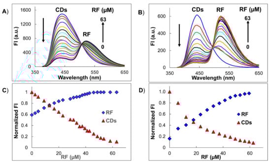 Spectra of the successive titration of CDs with RF at two donor concentrations (A) 4.0 × 10−2 mg/mL and (B) 5.0 × 10−3 mg/mL and the normalized fluorescence intensity signal versus RF at two donor concentrations (C) 4.0 × 10−2 mg/mL and (D) 5.0 × 10−3 mg/mL. The RF concentrations range from 0 µM to 63 µM in all experiments.