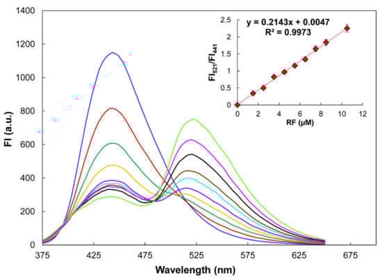 The calibration curve was obtained through the ratiometric measurement (I521/I441) of the RF fluorescence emission enhancement (λ = 521 nm) and the CDs fluorescence emission quenching (λ = 441 nm) at different RF concentrations. Figure 5 shows the variation in fluorescence spectra of CDs–RF conjugates in the presence of various RF concentrations. The inset of Figure 5 shows the RF calibration curve (average of three repetitions), with a linear concentration range from 0 to 11 µM, a correlation coefficient of 0.9973, and a detection limit (DL) of 0.025 µM. The DL of RF in CDs was calculated using the formula DL = 3σ blank/S, where σ is the standard deviation of the blank signal (n = 10) and S is the slope of the calibration curve. The ratiometric signal of the fluorescence intensities provides a very stable and reproducible measurement that eliminates the possible errors of the determination due to fluctuations in the source, photobleaching, background, etc.