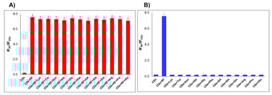 The influence of possible interfering substances that are commonly present in biological or food samples was also examined. Different representative substances, including L-amino acids (Lys, Trp, Asn, His, Gly, Phe, Ala, Gln, Arg, Pro, and Glu) and ascorbic acid (AA), were analyzed at pH 7.4. At physiological pH, the CDs are negatively charged (Figure S1) and the pH is above the isoelectric point of RF (pI = 6). Under these conditions, electrostatic interactions are not expected. However, all the interferences studied present groups that can form hydrogen bonds with the active groups on the surface of the nanoparticles. As can be seen in Figure 6A, only the CDs–RF signal showed a remarkable output, while the rest of the substances showed no significant fluorescence intensity variations. The selectivity of the CDs for RF is based on the energy transfer, which occurs only between these two moieties. The study was also carried out through competitive experiments in PBS solution at pH 7.4. The molar ratio of the RF:interfering substance was kept constant at 1:1. As can be seen in Figure 6B, the ratiometric measurement I521/I441 in the presence of RF and the corresponding interference showed a selective effect by RF over other substances, including L-amino acids (Lys, Trp, Asn, His, Gly, Phe, Ala, Gln, Arg, Pro, and Glu) and AA. These possible interferences in concentrations up to 20 µM do not affect the formation of the CDs–RF conjugate and do not interfere with the ratiometric fluorescence intensity of the nanoprobe. Therefore, the proposed nanosensor demonstrates high selectivity for RF determination.